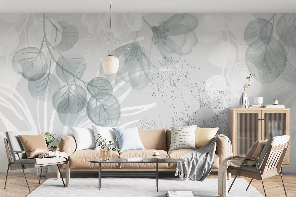 Papier peint Éléments floraux d'eucaliptus dans des tons bleus et blancs avec des feuilles et des pétales qui se chevauchent dans un style minimaliste N° w08599