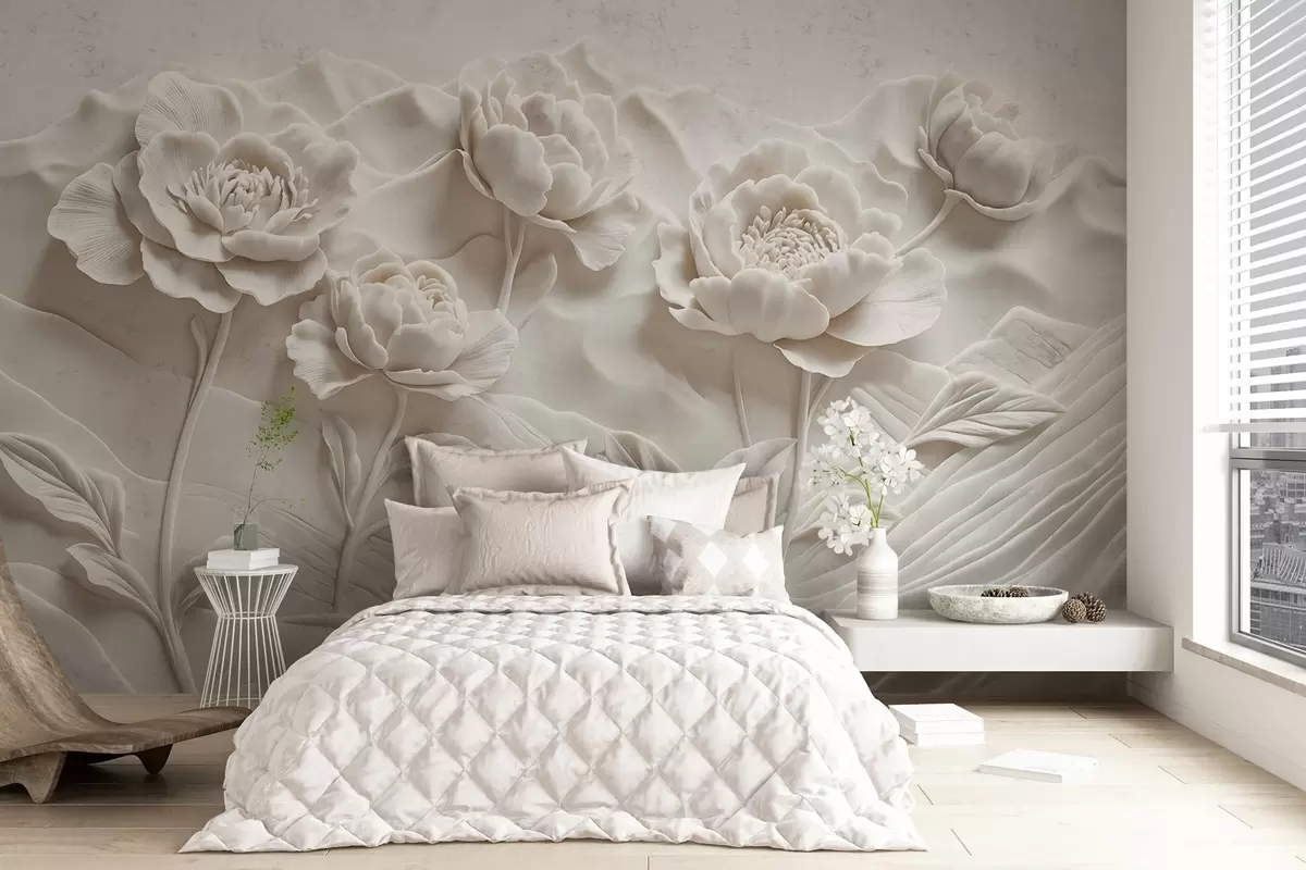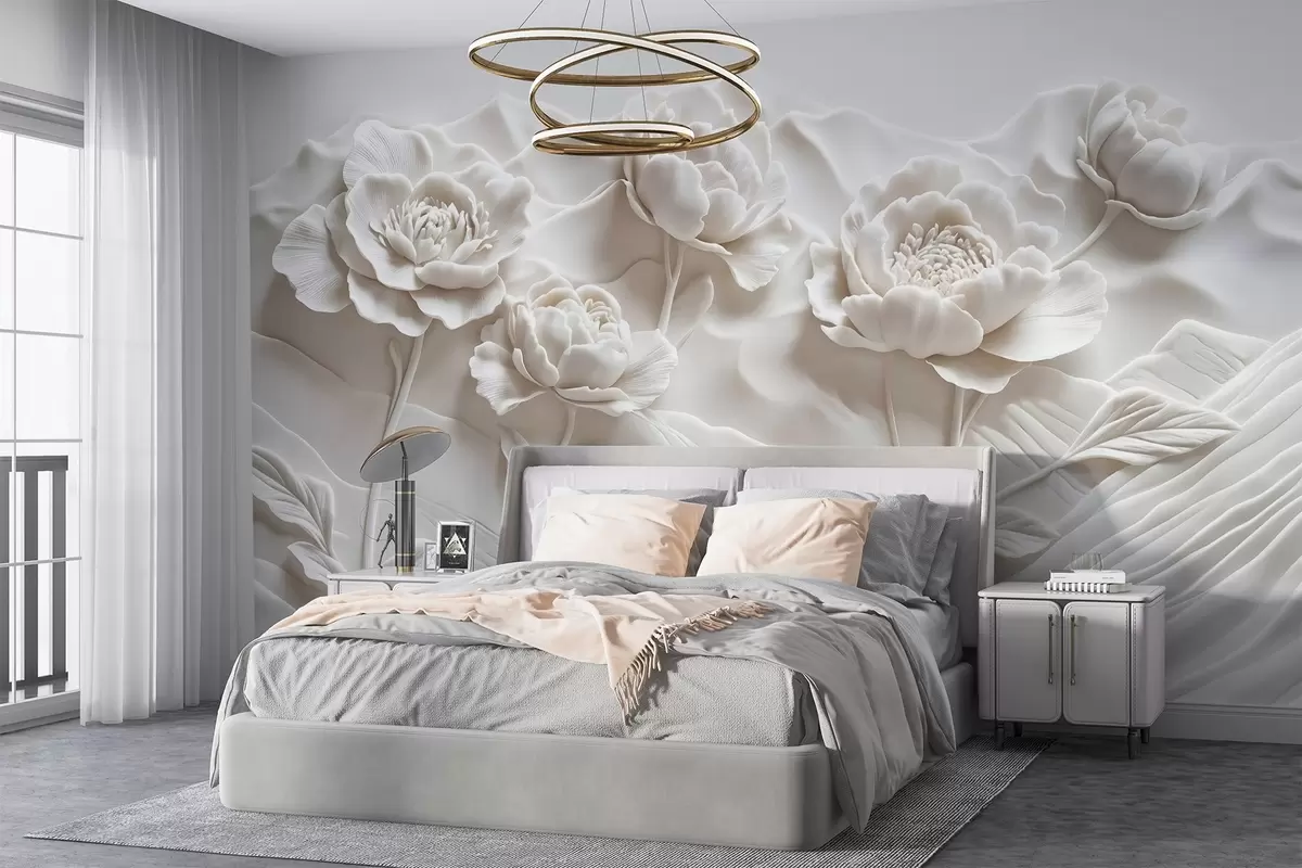 Papier peint Une imitation florale blanche de sculpture en relief avec de grandes fleurs de pivoine détaillées sur un fond uni N° w08612