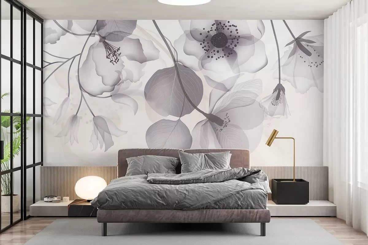 Papier peint Délicates fleurs translucides grises et beiges aux pétales doux et aux centres foncés, sur un fond clair N° w08613v2
