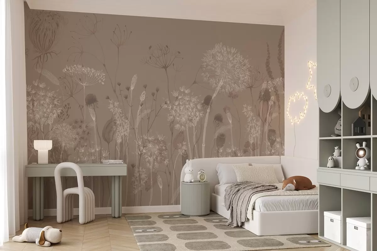 Papier peint Motif gracieux de pissenlits délicats, de plantes et de fleurs sauvages dans les tons beige-gris N° w08637v2