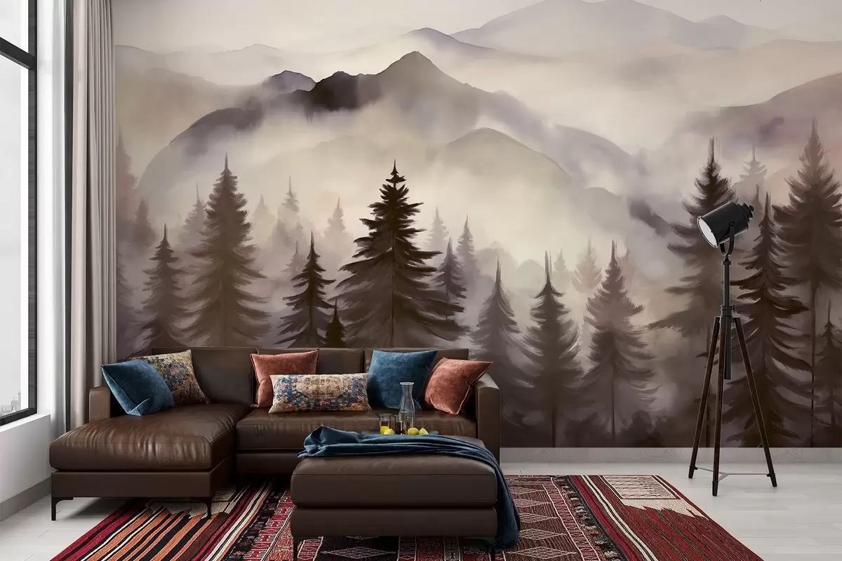 Papier peint Paysage de montagne avec une forêt de pins et des montagnes étagées à l'aube avec un léger brouillard aquarelle imitation art N° w08639v1