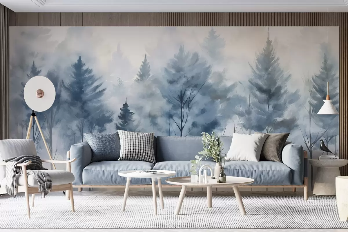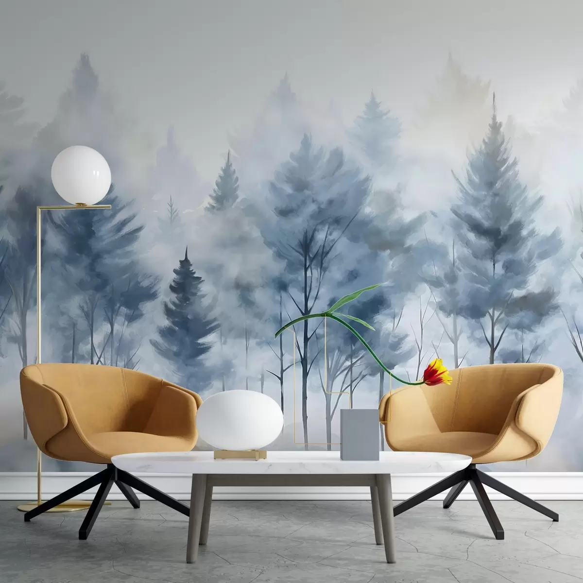 Papier peint Paysage forestier brumeux avec de grands pins et des arbres à feuilles caduques au premier plan aquarelle imitation art N° w08643