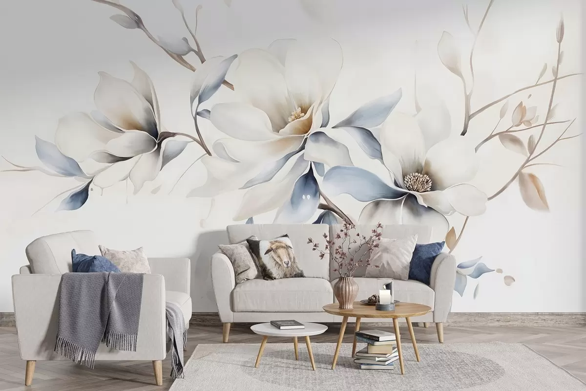 Papier peint Délicates fleurs de magnolia blanches avec des pétales bleus doux sur un fond clair aquarelle imitation minimalisme N° w08644
