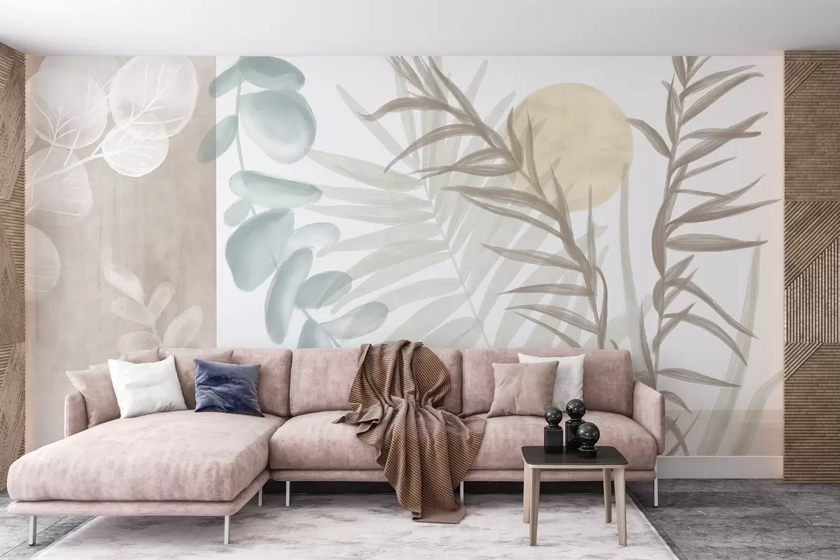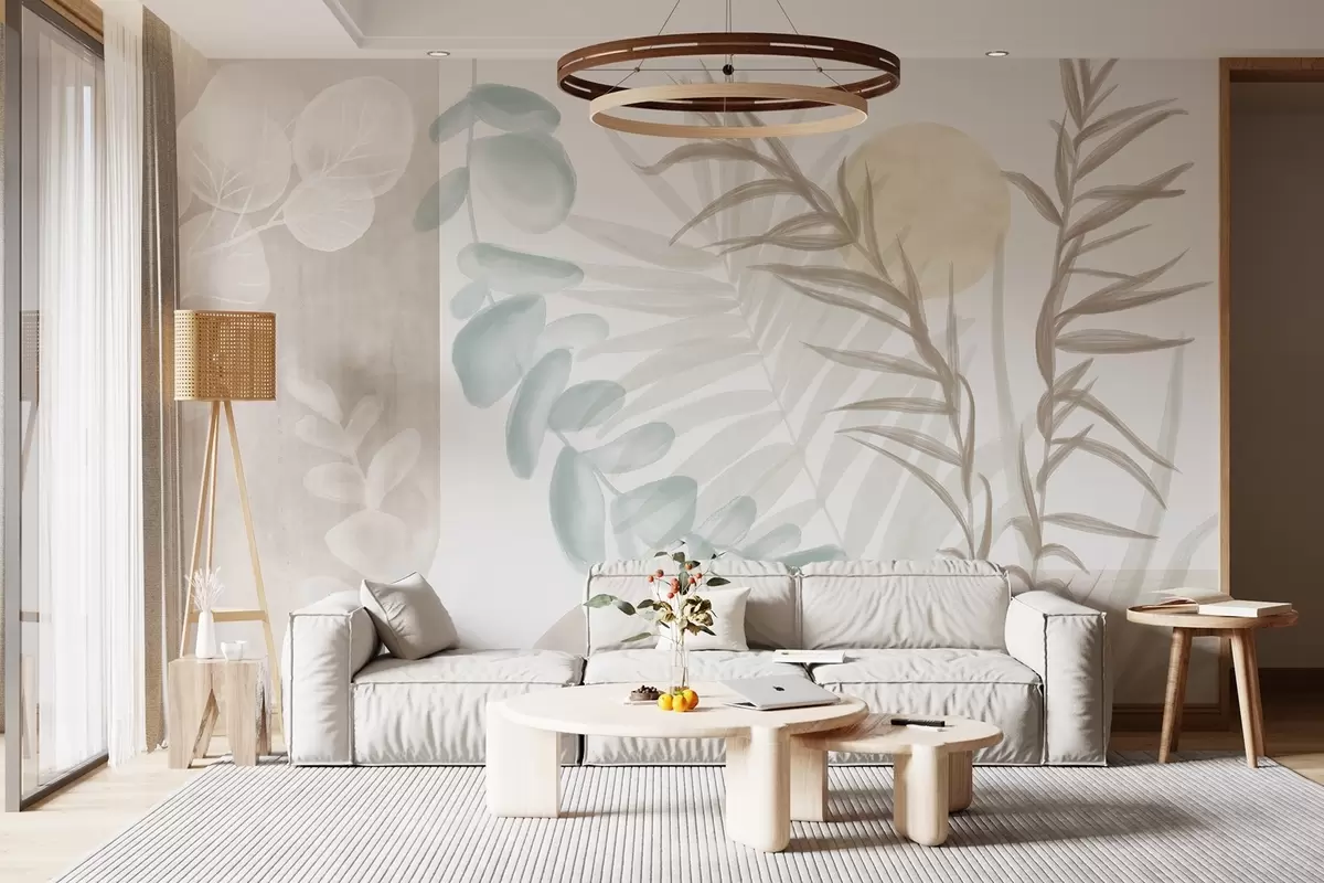 Papier peint Un imprimé abstrait minimaliste avec des feuilles stylisées et des eucaliptus aux formes organiques douces et beiges dans des couleurs pastel atténuées N° w08648