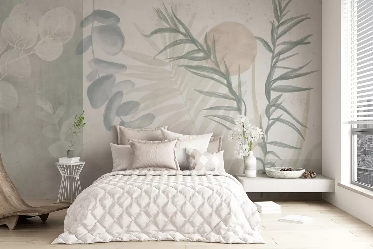 Papier peint Un imprimé abstrait minimaliste avec des feuilles stylisées et des eucaliptus aux formes organiques douces et bleues dans des couleurs pastel atténuées N° w08648v1