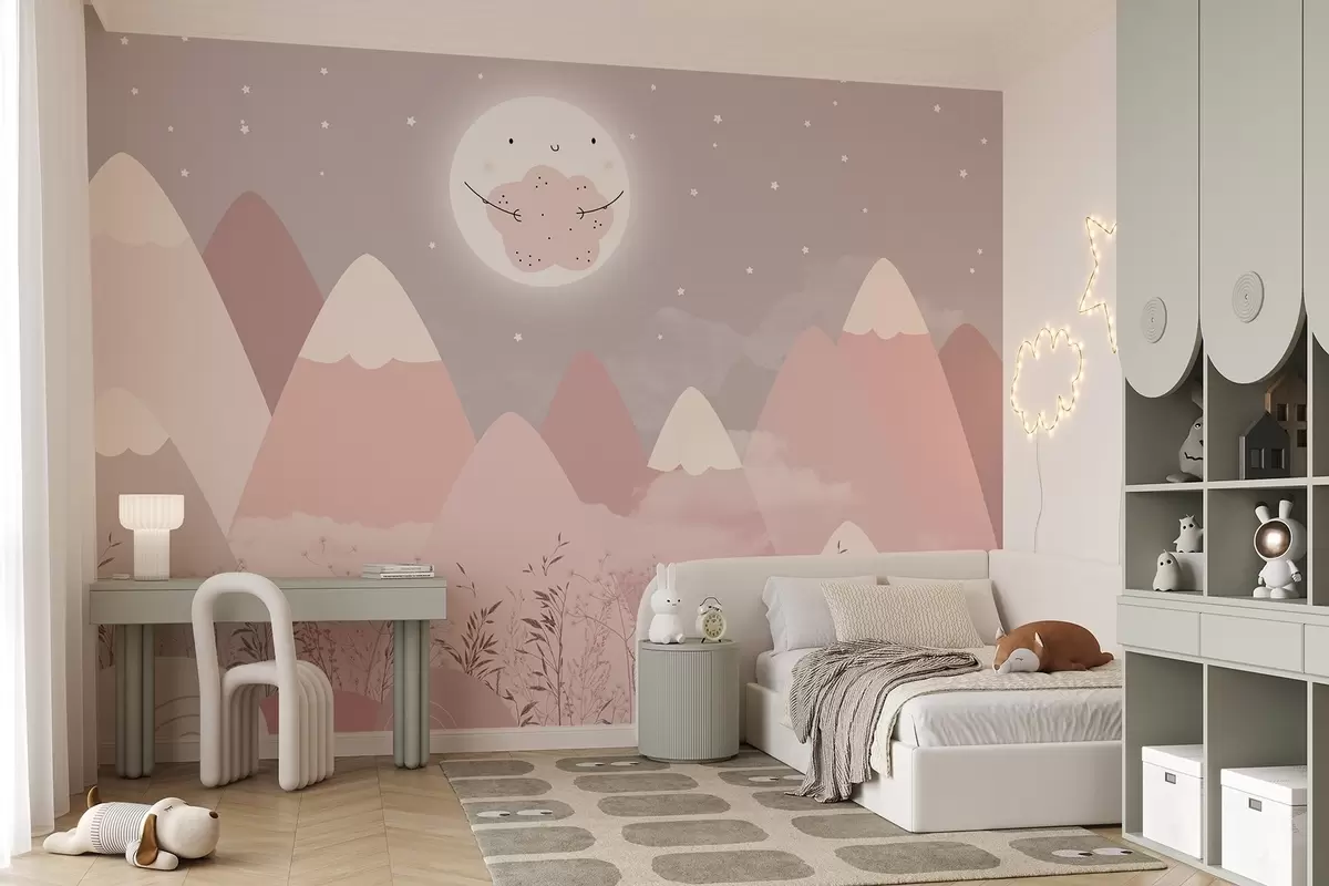 Papier peint Montagnes pour enfants avec une jolie lune et des plantes en bas N° w08659