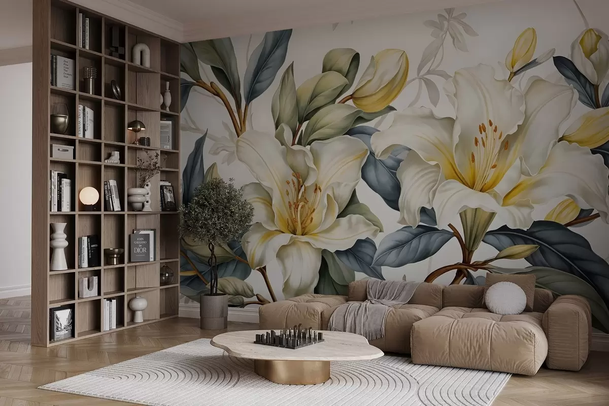 Papier peint Peinture de lys blancs avec des accents jaunes et des feuilles vertes et brunes, sur un fond clair N° w08661
