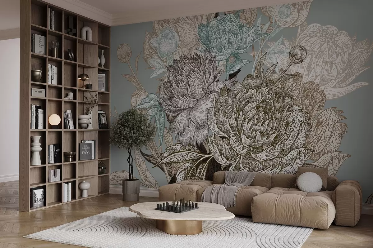 Papier peint Un motif floral détaillé comprenant de grandes pivoines et des feuilles dans des tons bleus, beiges et bruns N° w08663
