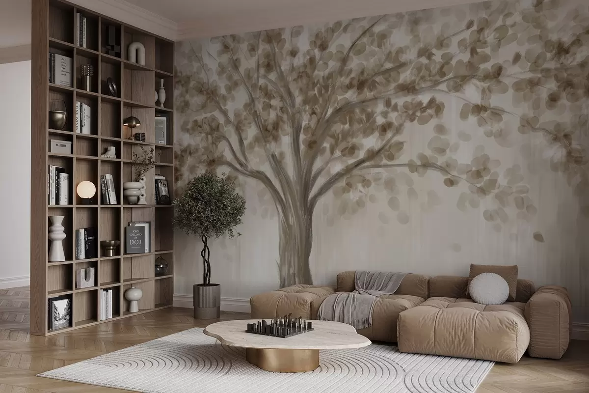 Papier peint Un grand arbre avec des feuilles douces et abstraites de couleur beige sur un fond clair et neutre mettant en valeur les tons de l'arbre N° w08669