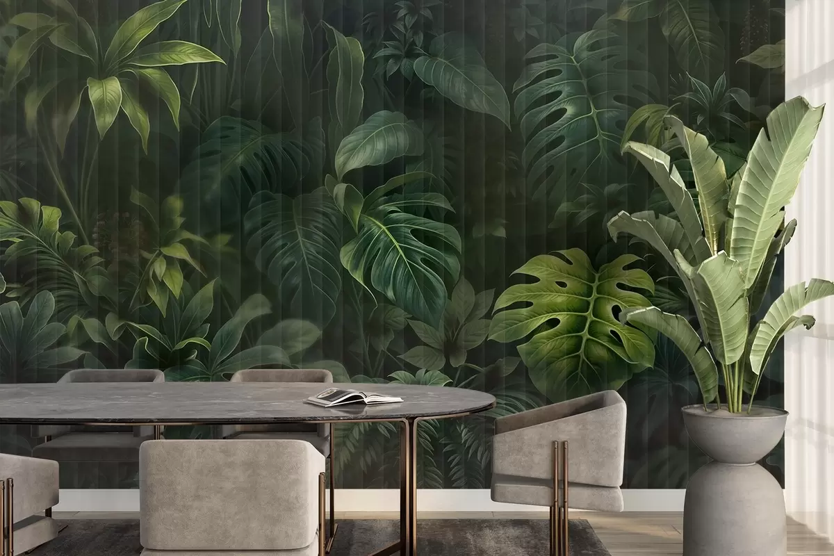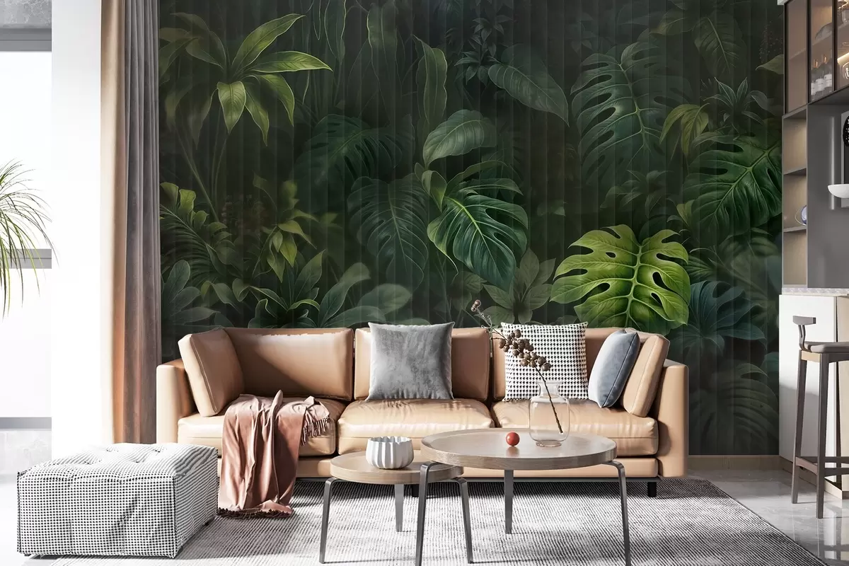 Papier peint Imprimé tropical sombre, flou et texturé avec diverses feuilles vertes, dont des feuilles de monstera et de palmier N° w08673