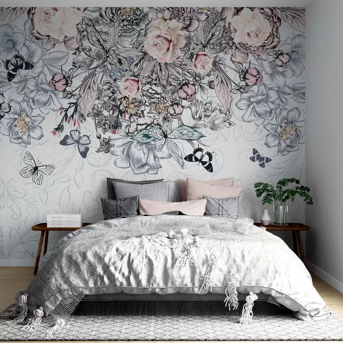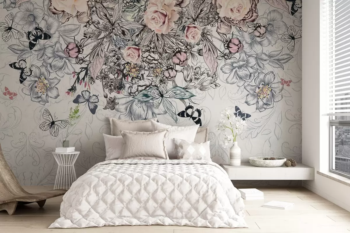 Papier peint Dessin floral avec des roses roses et diverses fleurs et papillons avec un dessin au trait complexe sur fond texturé N° w08674