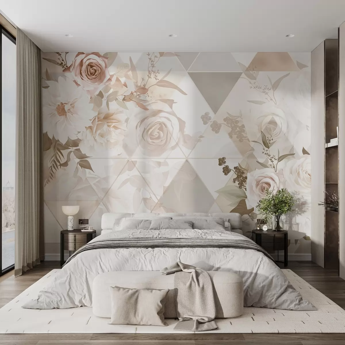 Papier peint Bouquets de roses et de pivoines sur un fond à motifs dans les tons beige clair N° w08679