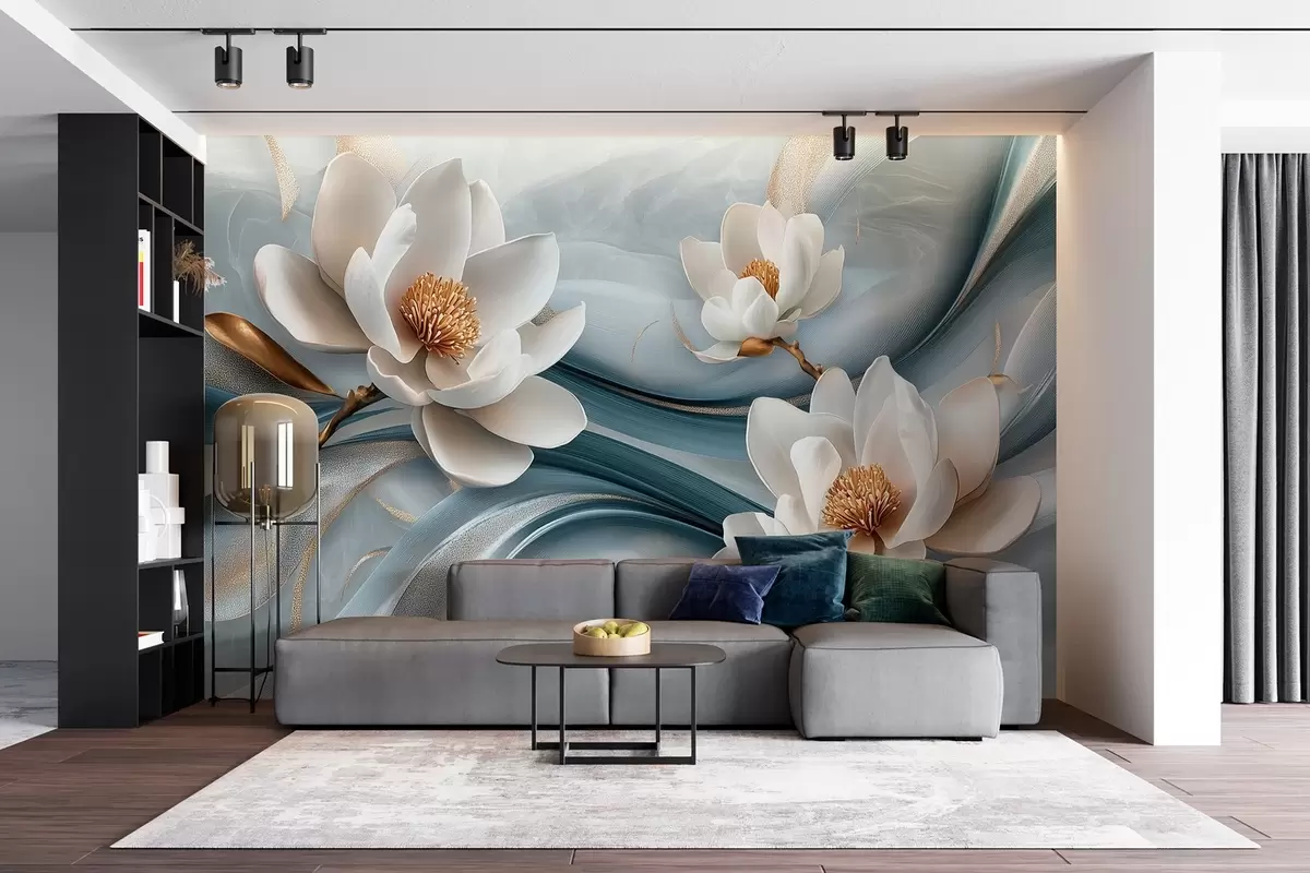 Papier peint Fleurs de magnolias combinées à des tons bleus, blancs et jaunes avec des vagues abstraites N° w08695