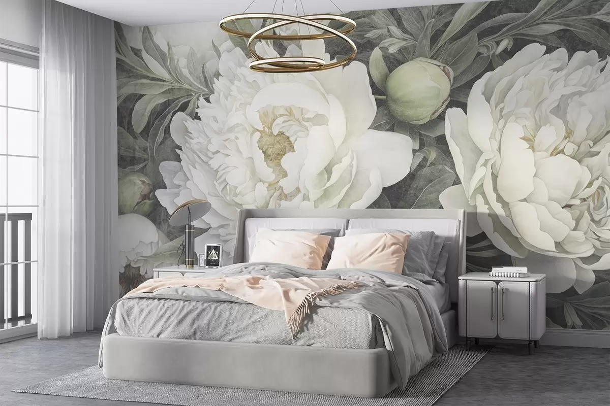 Papier peint Pivoines texturées blanc pastel avec bourgeons et feuilles vert tendre aux pétales délicats N° w08697