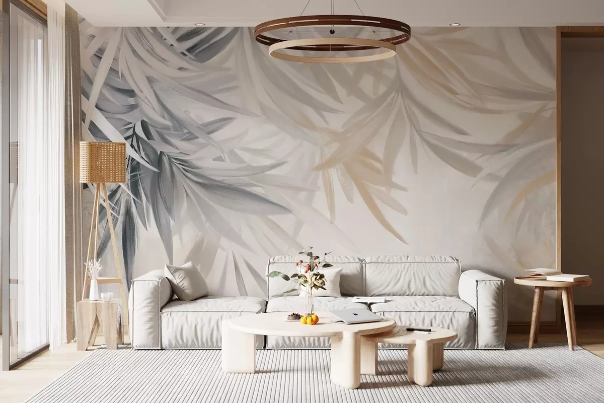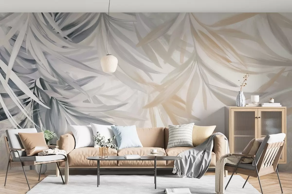 Papier peint Feuilles tropicales douces et fluides de couleur claire dans des tons gris et pêche, se fondant dans un imprimé pâle et neutre N° w08703
