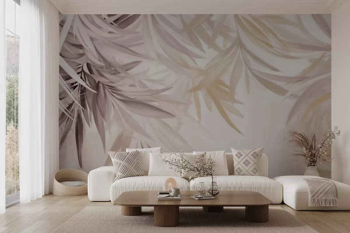Papier peint Feuilles tropicales douces et fluides de couleur claire, dans des tons de brun et d'orange, se fondant dans un imprimé pâle et neutre N° w08703v1