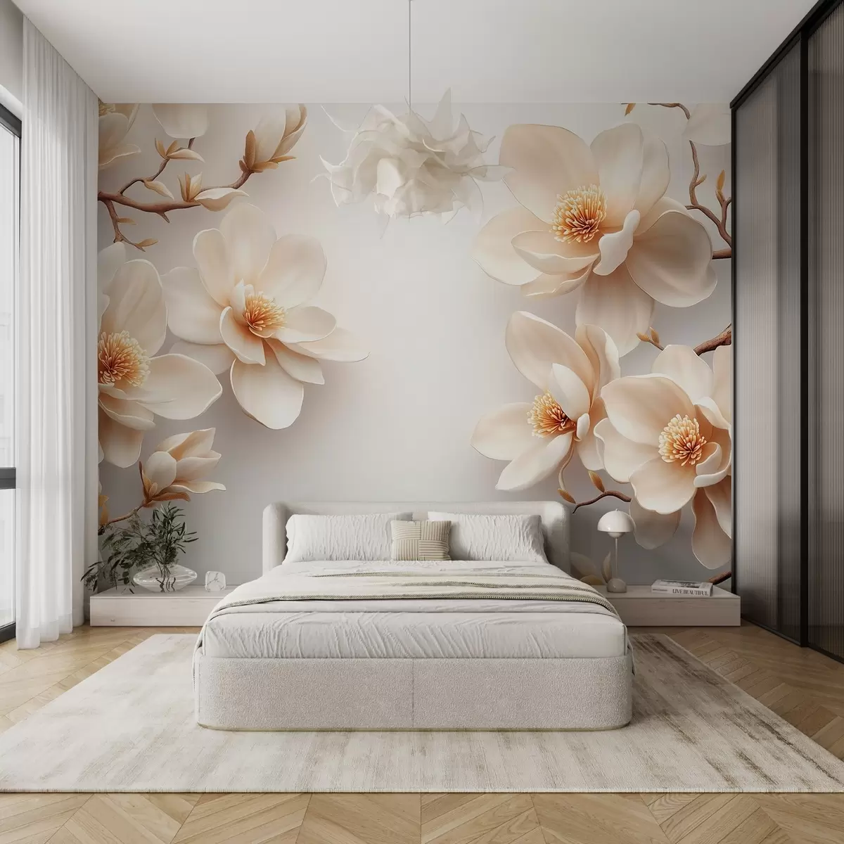 Papier peint Magnifiques fleurs de magnolia de couleur crème sur fond blanc N° w08704