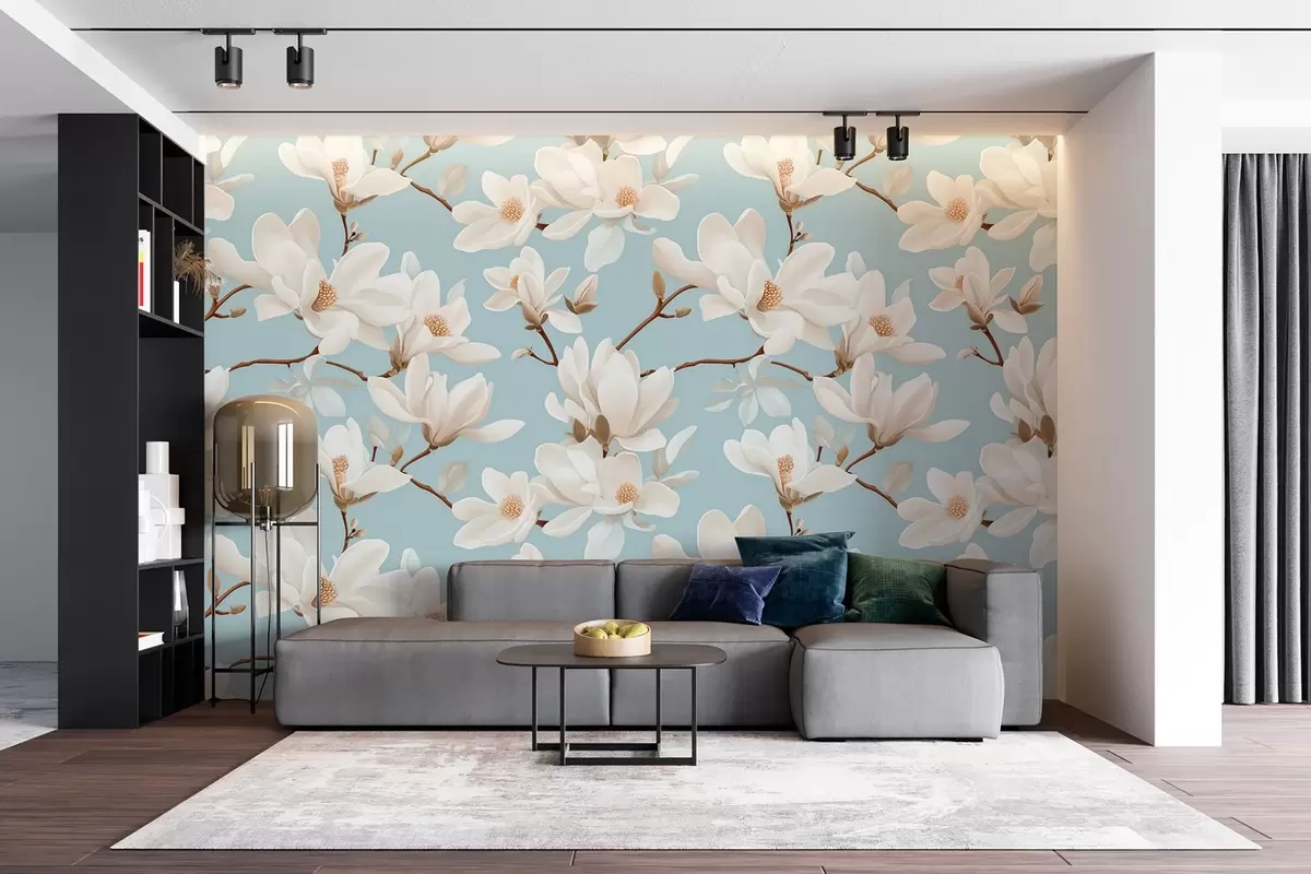 Papier peint Motif de fleurs de magnolia blanches, fond bleu pastel, feuilles et branches blanches N° w08726