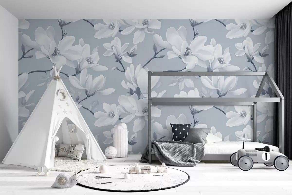 Papier peint Motif de fleurs de magnolia blanches, dans des tons bleu clair, feuilles et branches blanches N° w08726v2