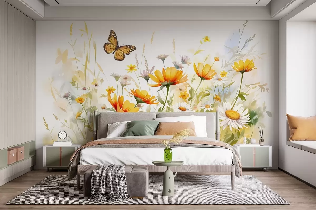 Papier peint Un champ de fleurs vibrant, semblable à une aquarelle, avec des fleurs orange et jaunes et un papillon au-dessus des fleurs N° w08739
