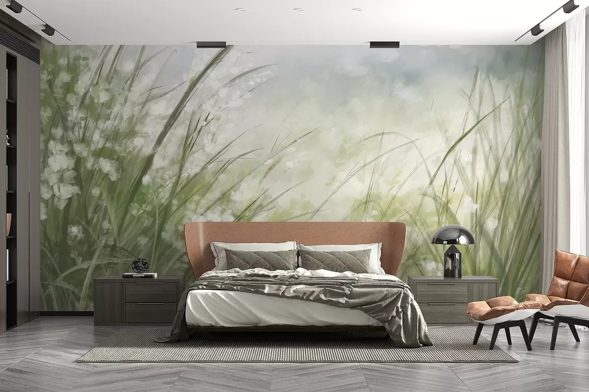Papier peint Herbe verte luxuriante et fleurs blanches délicates, impression doucement floue avec des teintes claires, créant un paysage paisible N° w08779