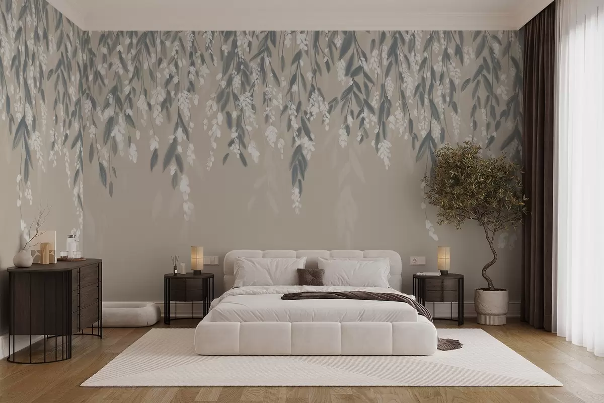 Papier peint Branches de feuillage en cascade dans des tons de vert atténué avec des fleurs et des feuilles blanches sur fond beige N° w08781