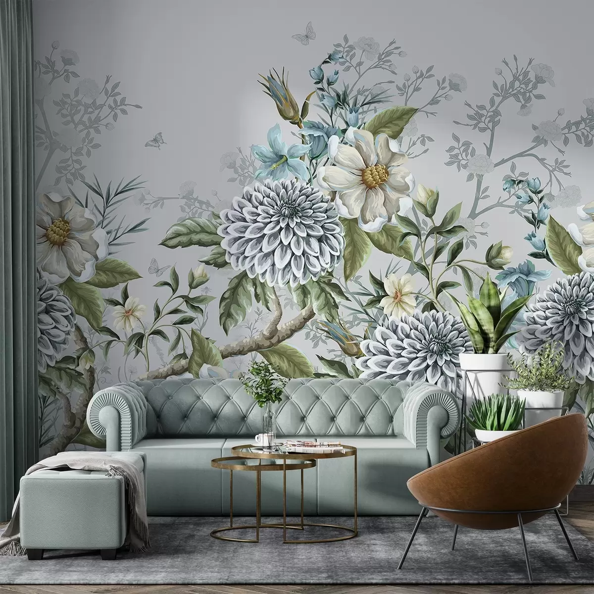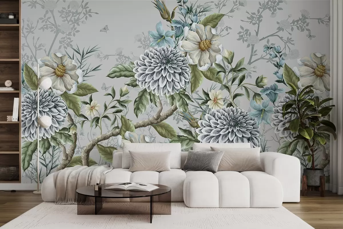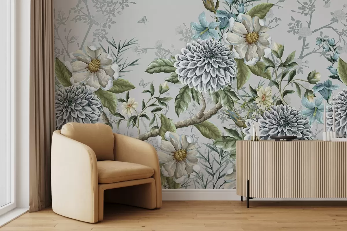 Papier peint Imprimé floral composé de chrysanthèmes, de fleurs bleues délicates et de feuilles vertes entrelacées de branches N° w08782