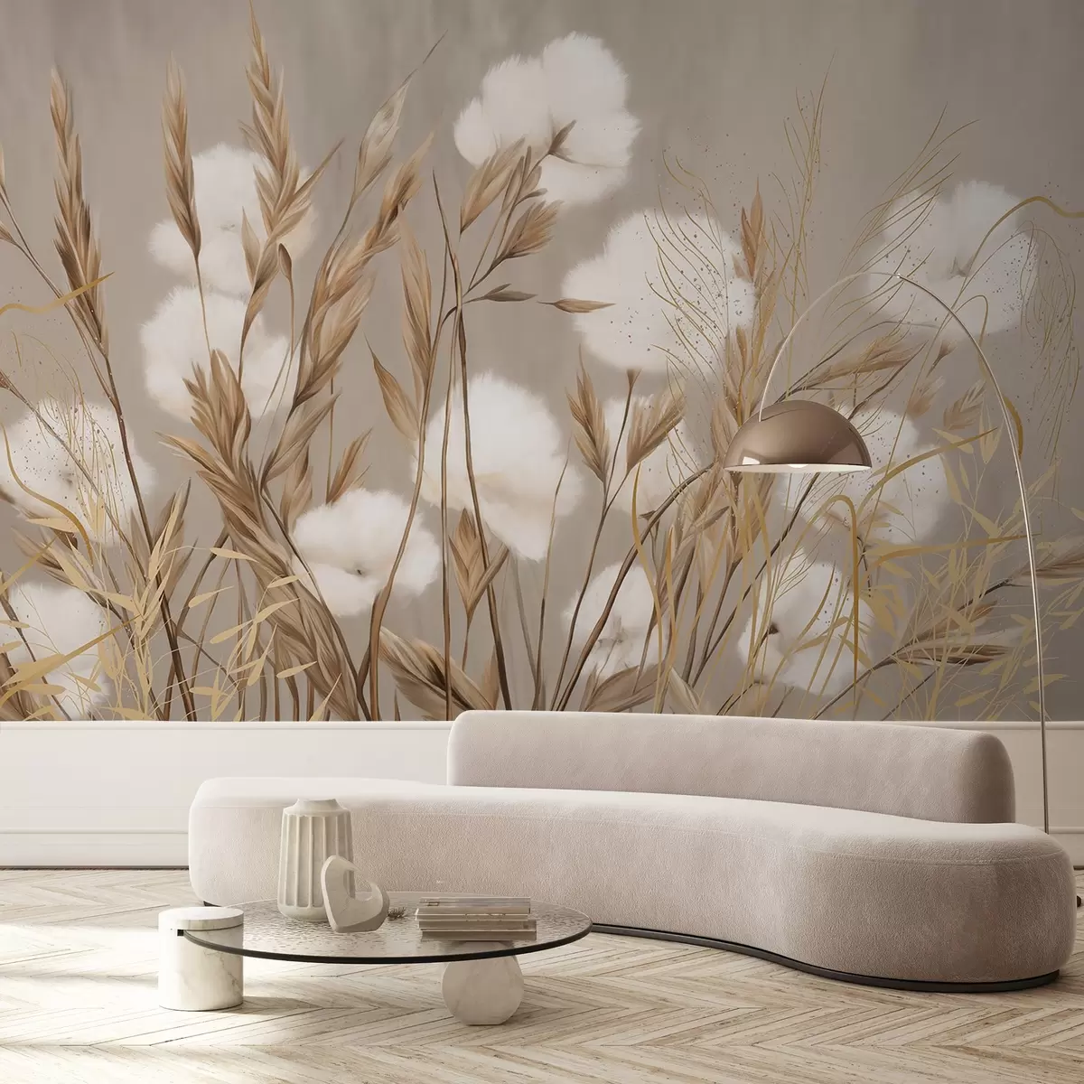 Papier peint Fleurs blanches en coton doux et duveteux et hautes herbes en épis orange sur un fond beige texturé N° w08784