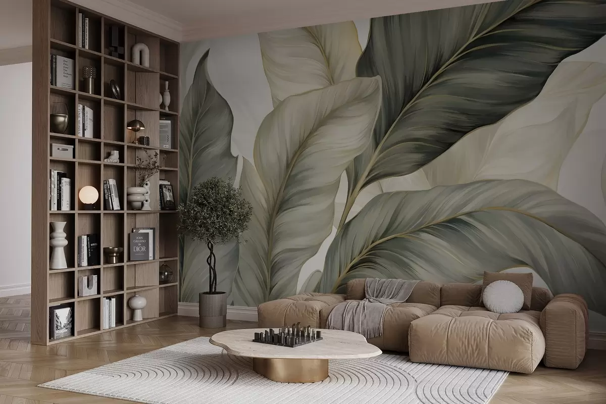 Papier peint Grandes feuilles texturées stylisées avec des veines détaillées dans différentes nuances de vert, crème et beige N° w08785