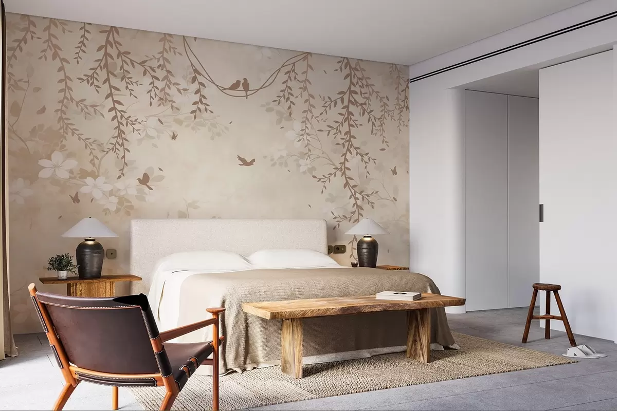 Papier peint Oiseaux avec plantes suspendues et motif floral dans les tons beige-crème clair N° w08809
