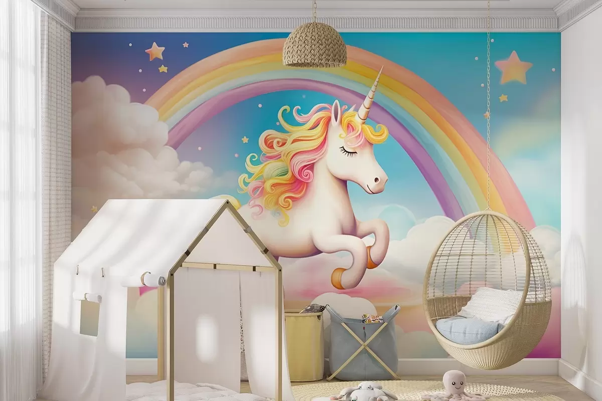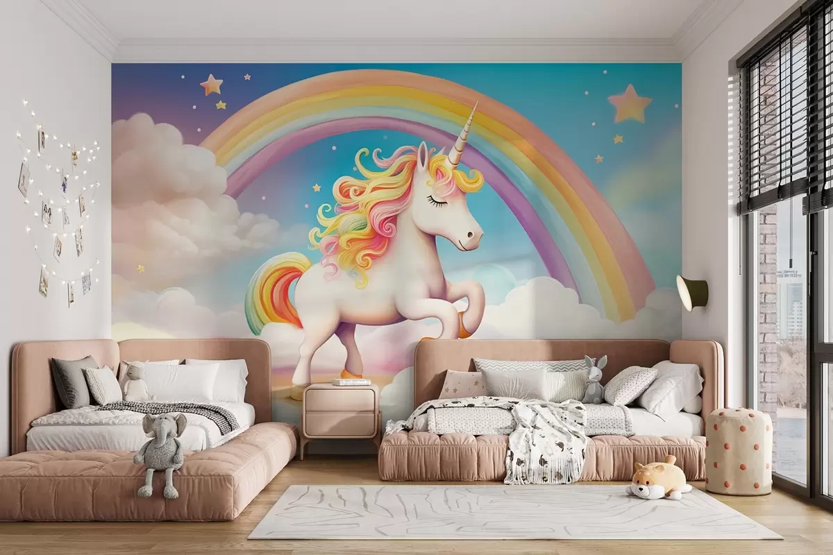 Papier peint Un cheval licorne avec un arc-en-ciel, des nuages et un ciel étoilé N° w08820