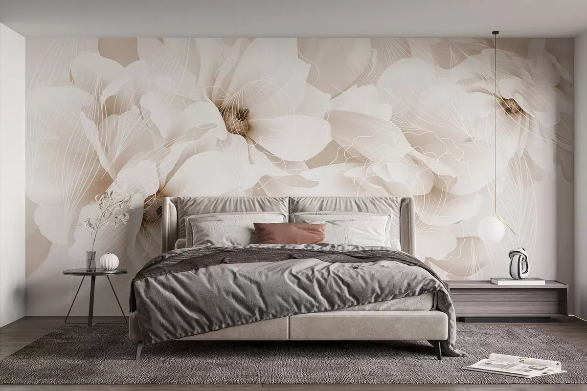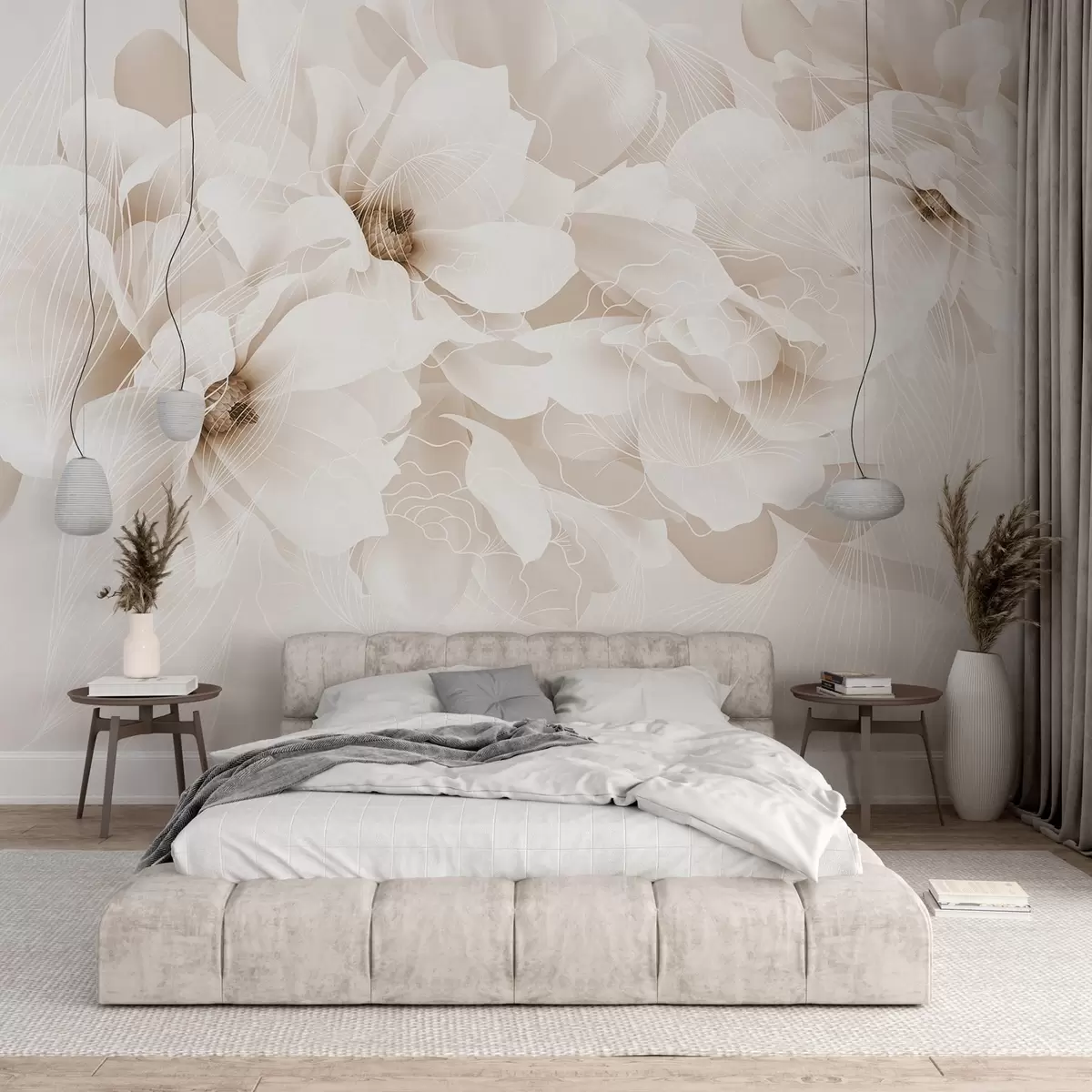 Papier peint Fleurs de pivoine pastel avec des pétales délicats blancs et beiges et des lignes blanches sur un fond beige clair N° w08826v1