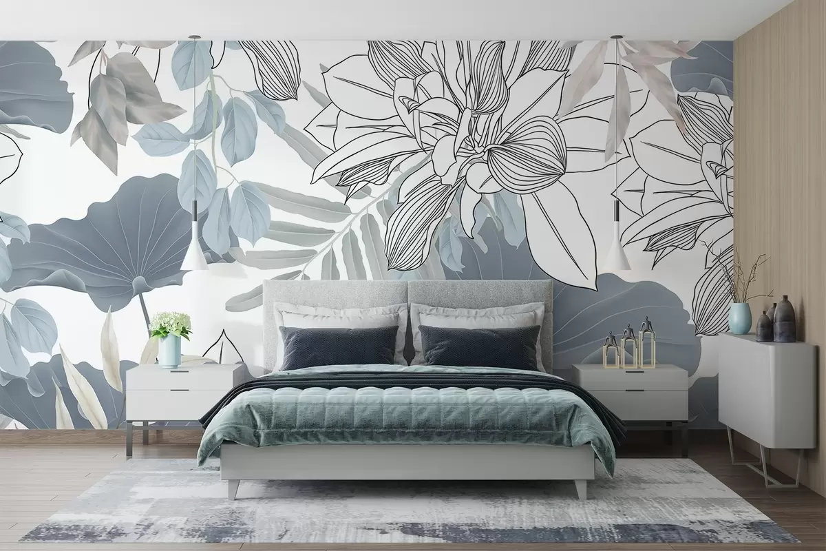 Papier peint Imprimé floral avec fleurs et feuilles de lotus en bleu et blanc sur fond blanc N° w08827