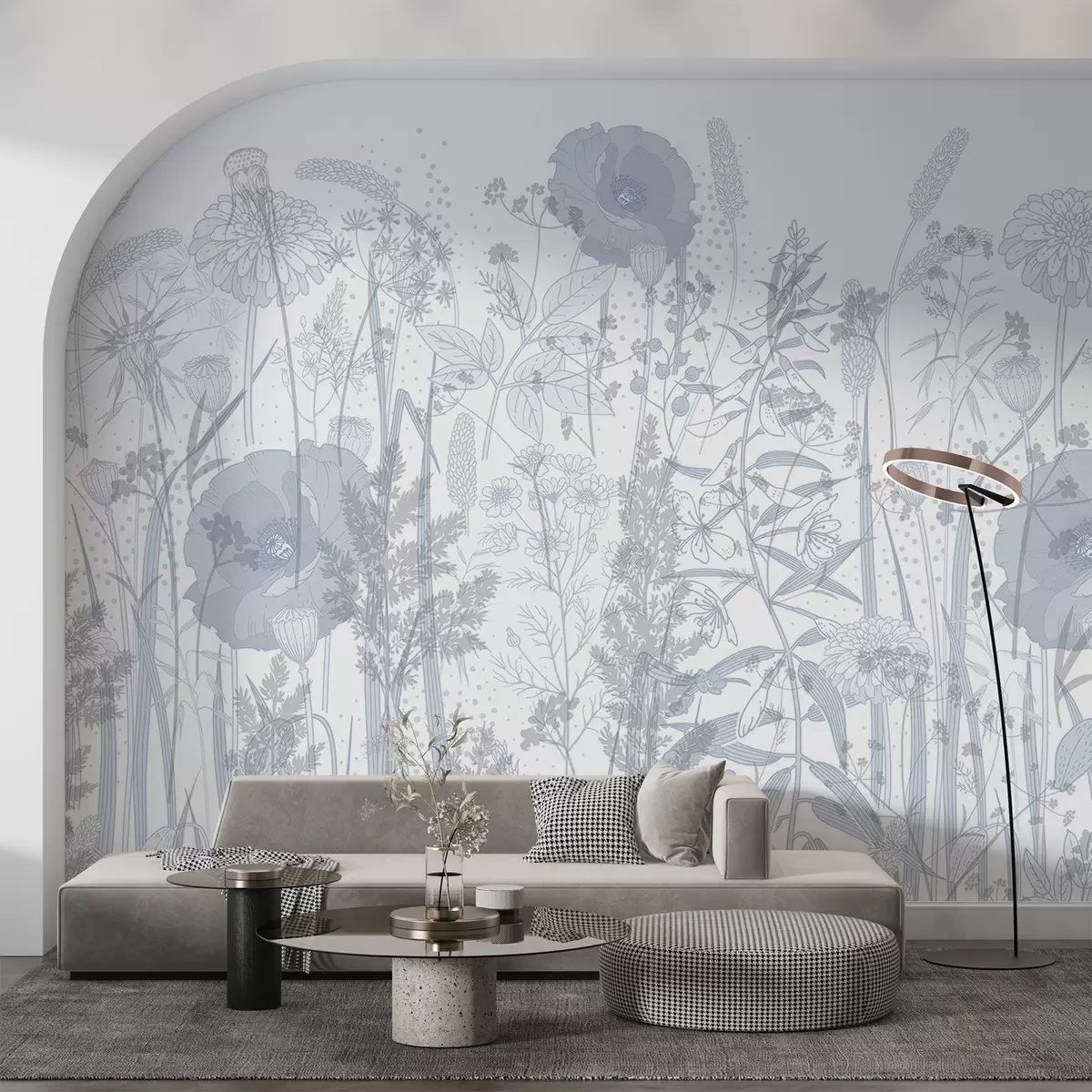Papier peint Un champ de fleurs hautes et d'herbe dans des tons pastel bleu clair sur un fond blanc N° w08829