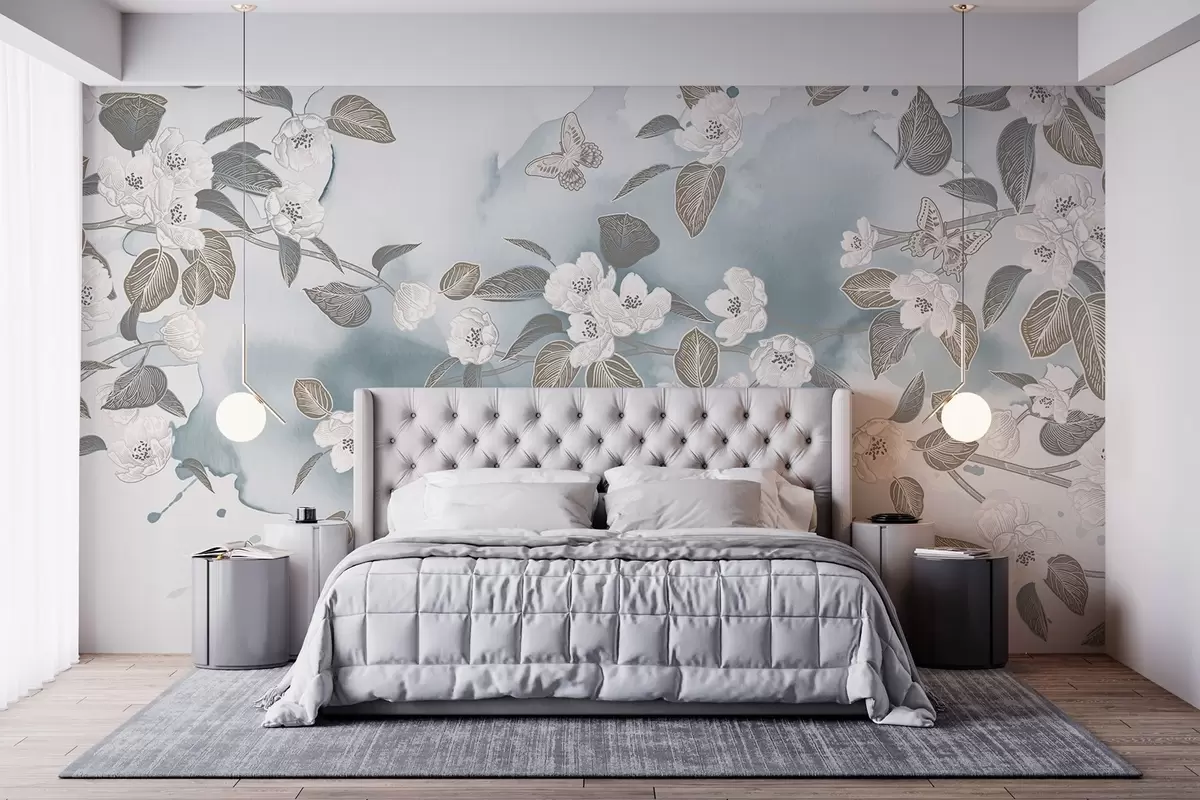 Papier peint Branche de cerisier avec fleurs, feuilles et papillons sur un fond texturé aquarelle bleu clair N° w08831v1