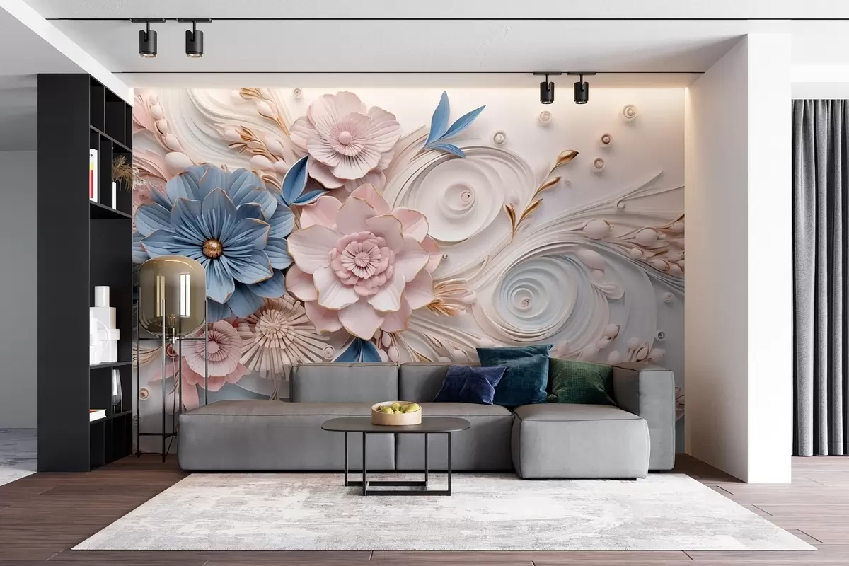 Papier peint Une délicate composition florale dans des tons roses et bleus avec un fond en relief doux N° w08847