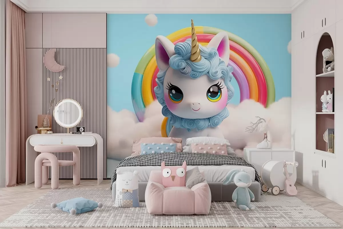 Papier peint Une jolie licorne en 3D entourée de nuages et d'un arc-en-ciel N° w08848