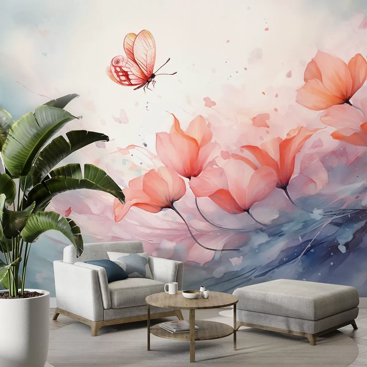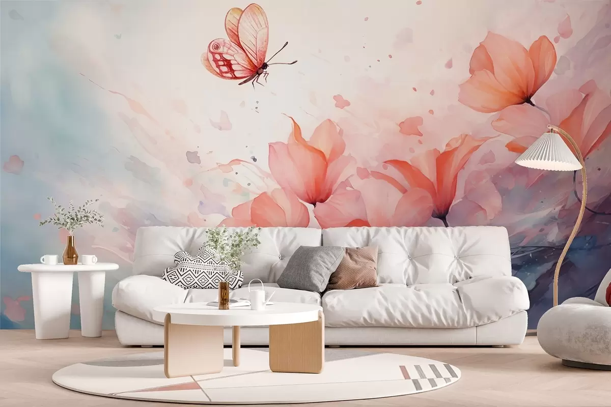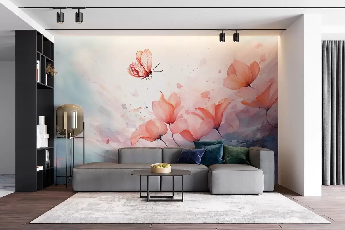 Papier peint Coquelicots délicats avec un papillon dans un style aquarelle N° w08849