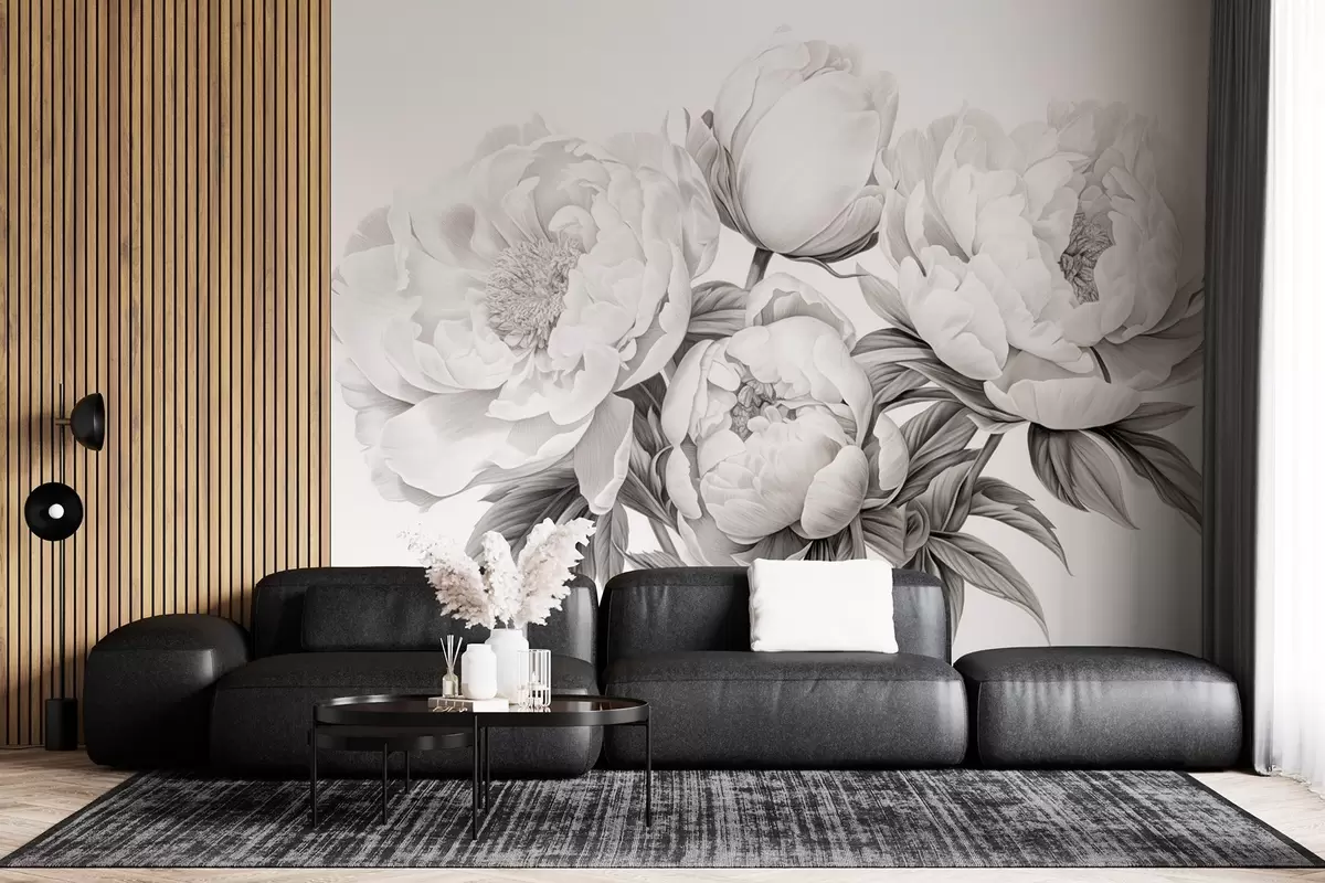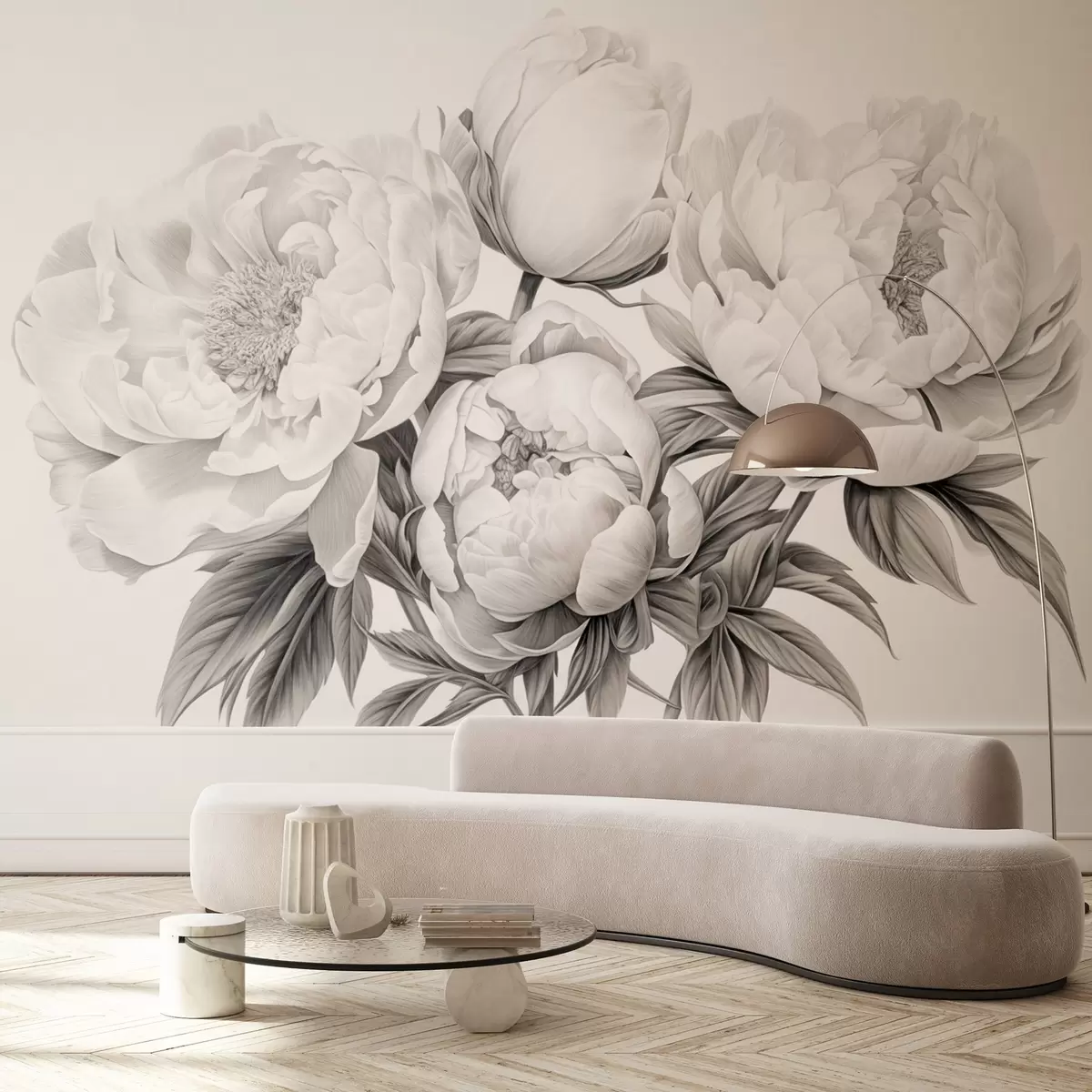 Papier peint Pivoines noires et blanches dans un style de dessin au crayon N° w08852