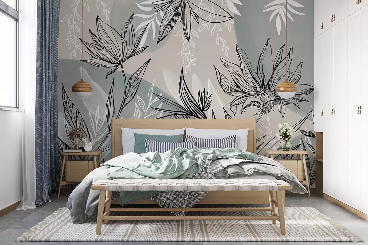Papier peint Dessin au trait floral avec de grandes feuilles et des fleurs, sur un fond de lavis d'aquarelle beige et bleu N° w08865