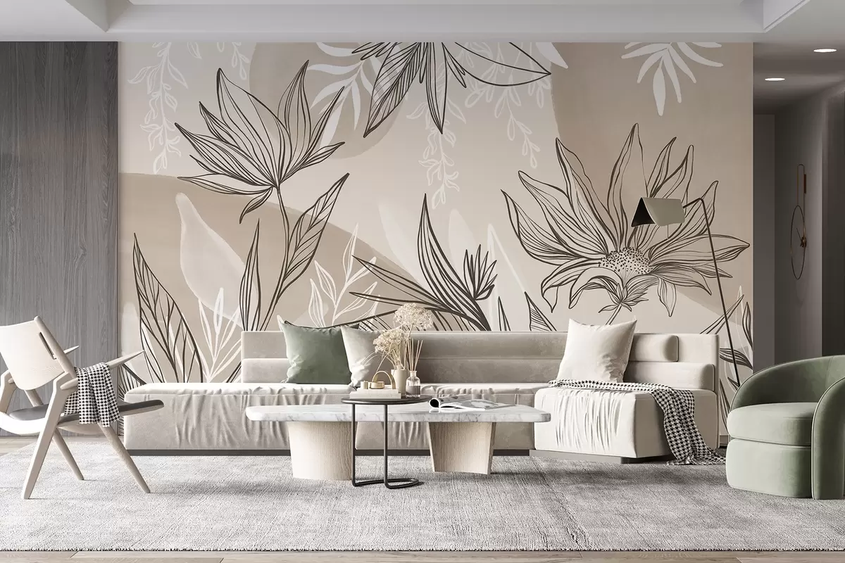 Papier peint Dessin au trait floral avec de grandes feuilles et des fleurs, sur un fond de lavis d'aquarelle beige N° w08865v1