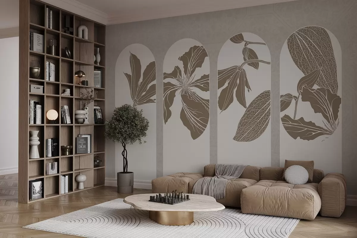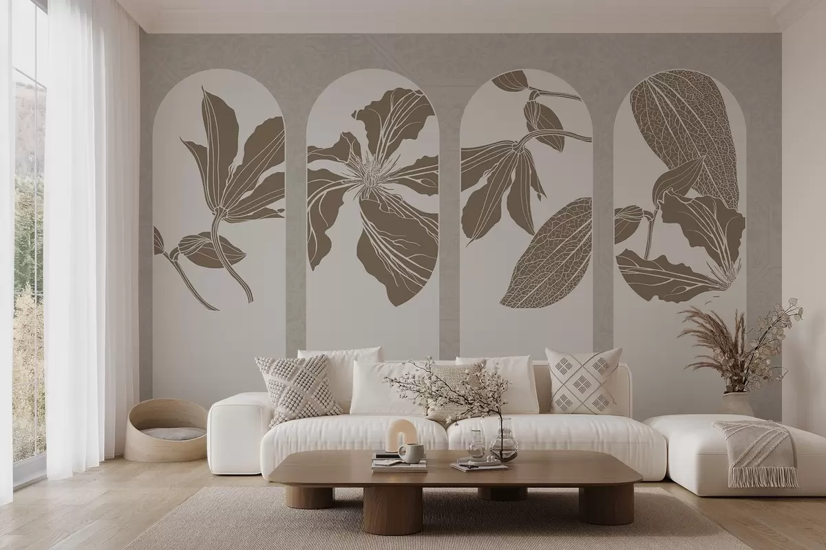 Papier peint Arcs élégants avec des motifs floraux en beige et blanc, sur un fond beige texturé, style minimaliste N° w08866