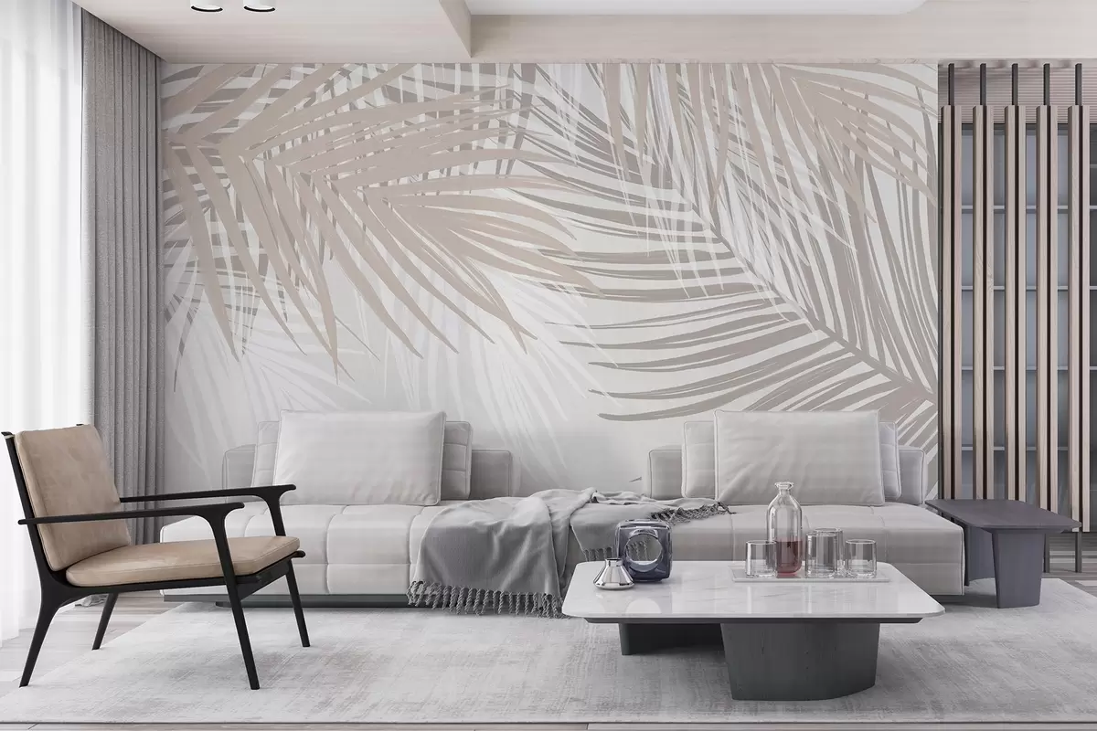 Papier peint Feuilles de palmier dans les tons beige clair et blanc, feuillage tropical, couleurs pastel douces, design minimaliste N° w08869