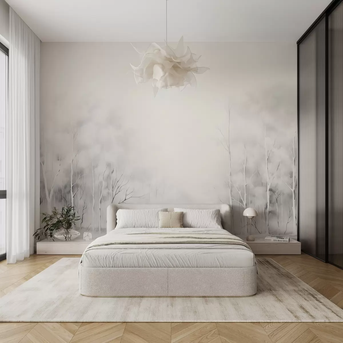 Papier peint Arbres dans la brume en style aquarelle sur fond chaud N° w08875