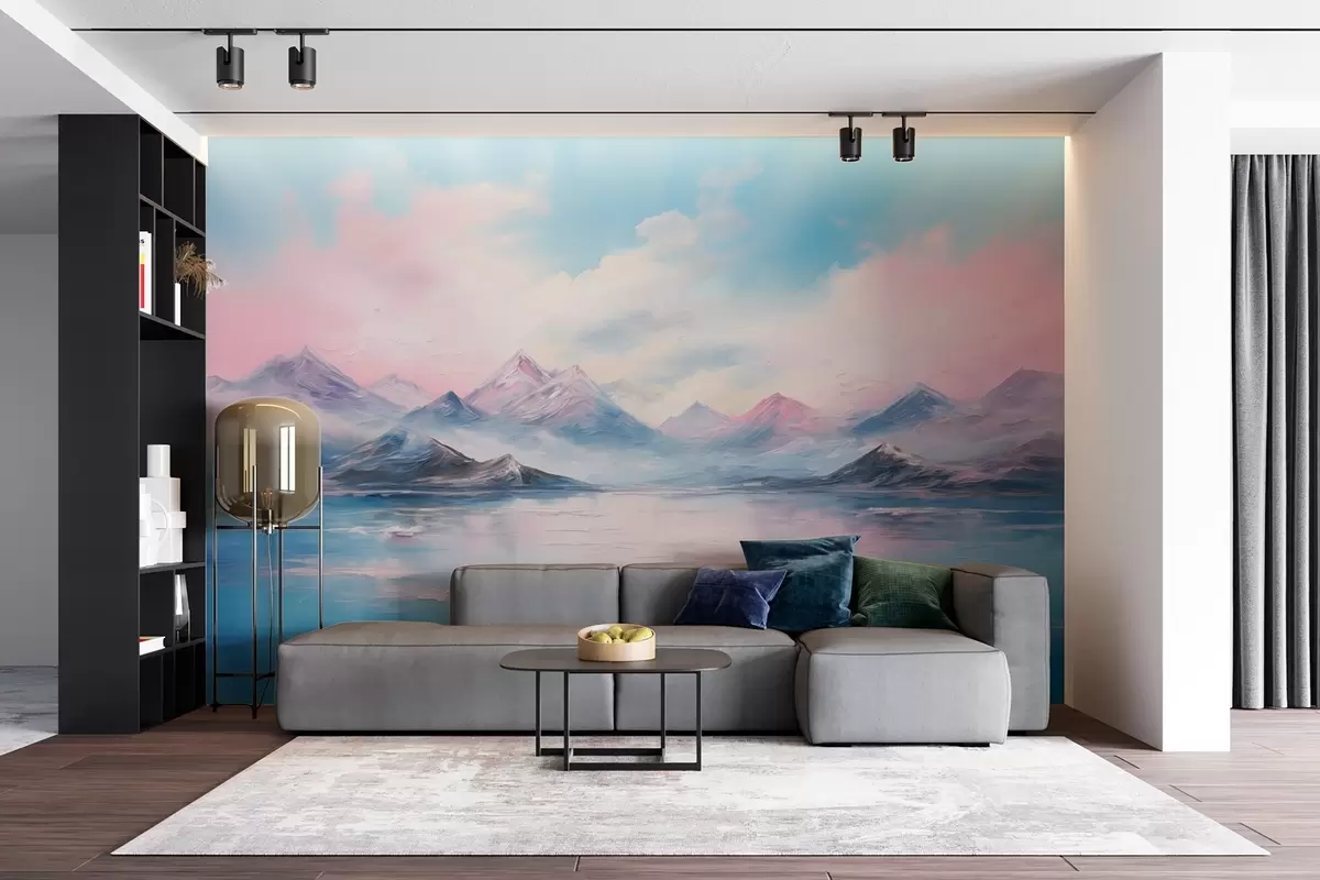 Papier peint Paysage coloré au pinceau dans des tons roses et bleus, avec des montagnes, un lac et des nuages N° w08878