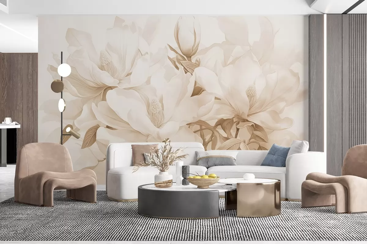 Papier peint Fleurs de magnolia aux pétales blancs et beiges, feuilles et branches brunes, style aquarelle douce et délicate N° w08886