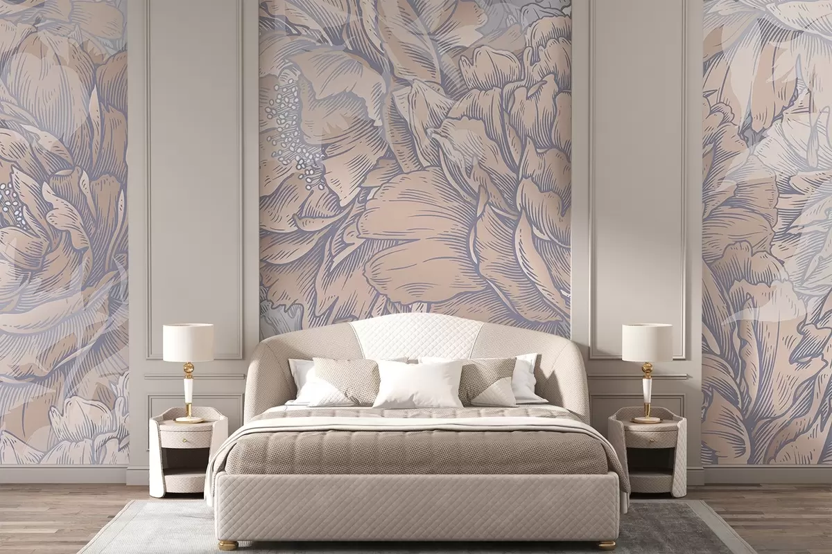 Papier peint Fleurs de pivoine avec pétales et étamines détaillés, couleurs pastel douces, style illustration botanique vintage N° w08890