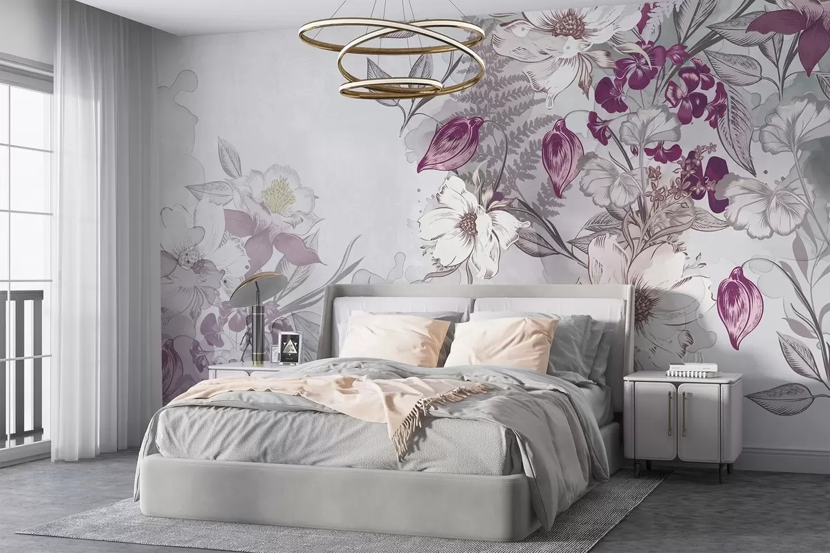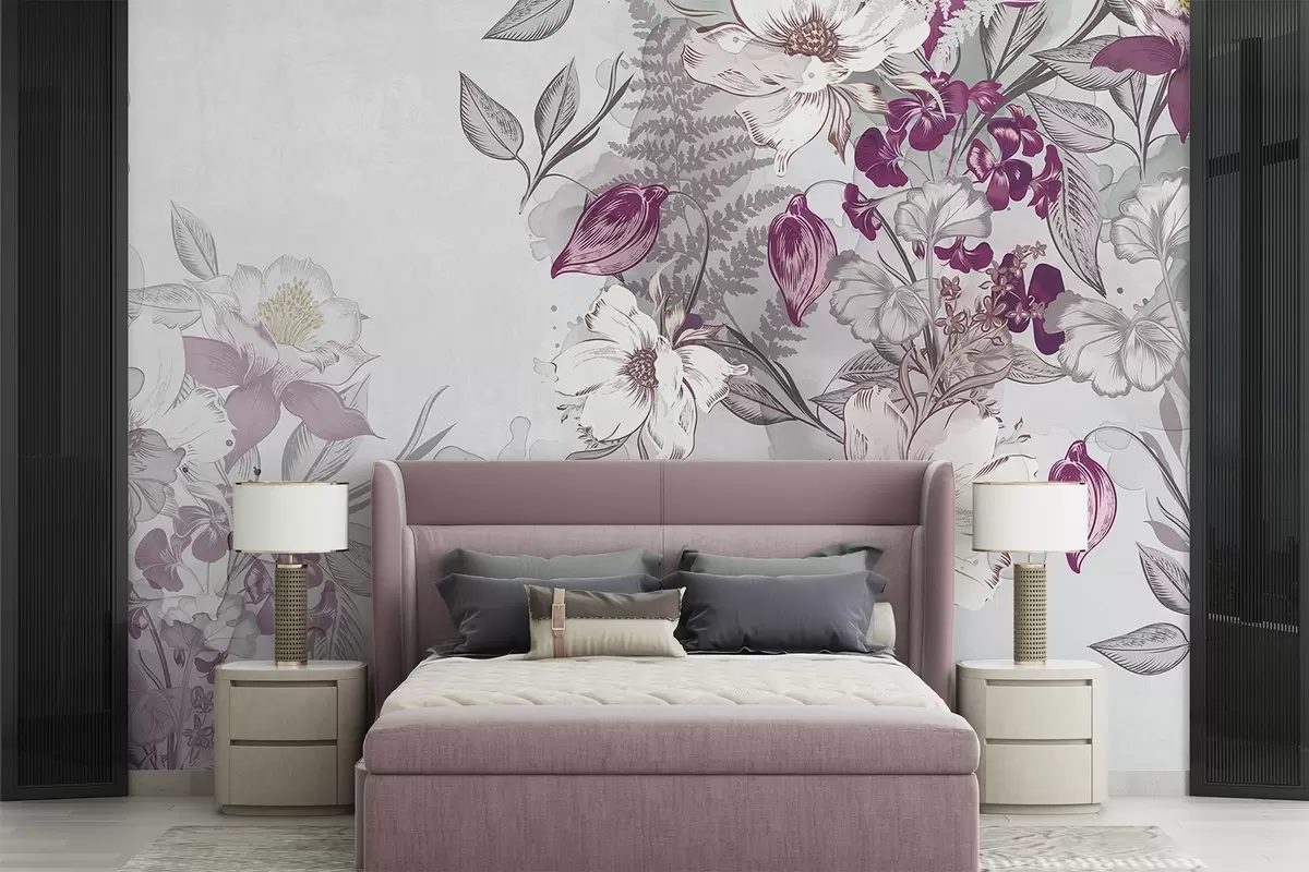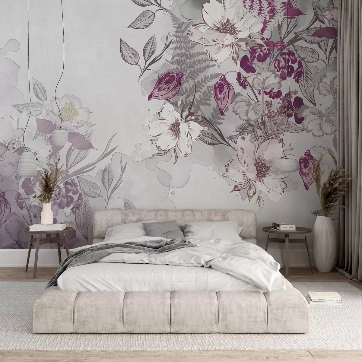 Papier peint Fleurs avec pétales, feuilles et tiges blanches et violettes, effet aquarelle, fond texturé gris clair N° w08899