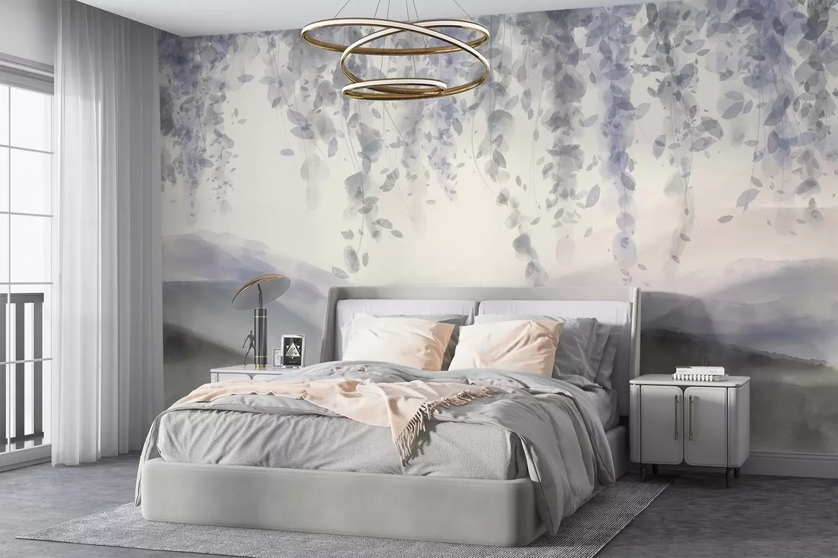 Papier peint Feuilles de glycine suspendues au-dessus de montagnes bleues, couleurs douces bleu pastel et gris, paysage de style aquarelle N° w08909