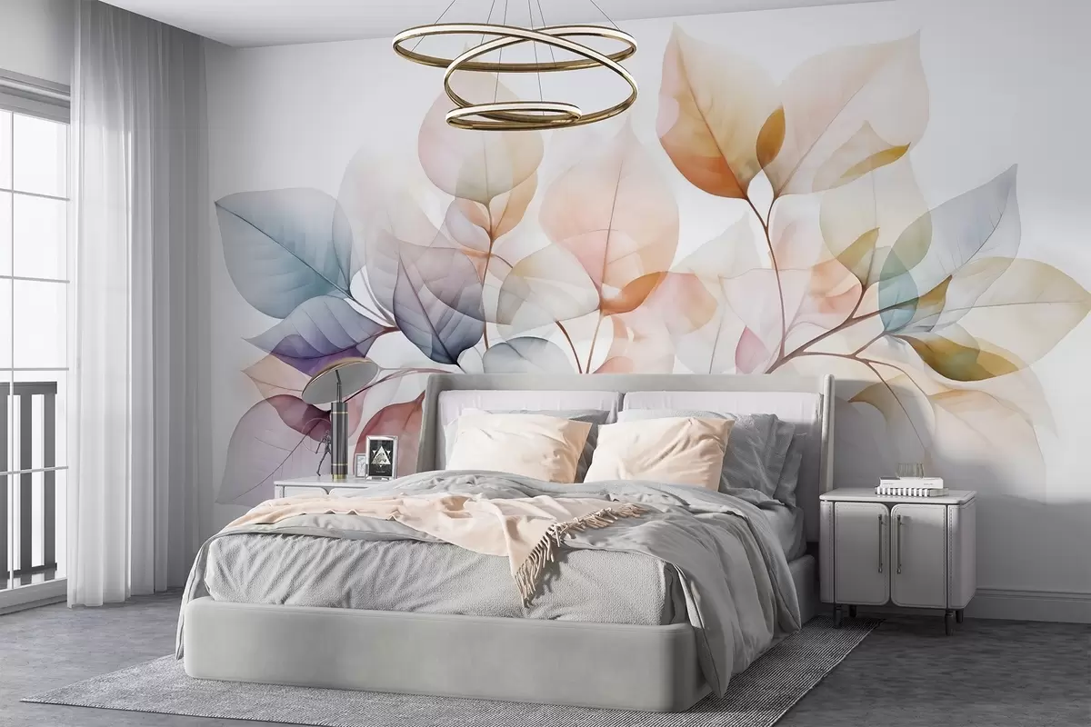 Papier peint Aquarelle de feuilles translucides aux couleurs pastel, avec des nuances de rose, de blanc, de violet et de bleu N° w08910